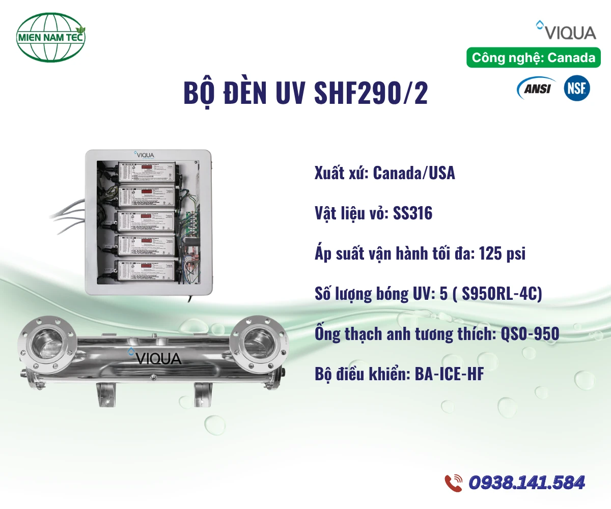 Thông số của bộ đèn UV VIQUA SHF-290/2 – vỏ inox 316, 5 bóng công suất cao, đạt chuẩn NSF Class A.