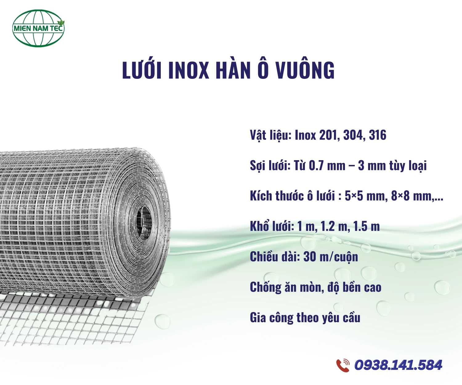 Lưới inox hàn ô vuông là sản phẩm có độ bền cao, đa dạng quy cách và phù hợp cho nhiều lĩnh vực công nghiệp – dân dụng. Với khả năng chống gỉ, chịu lực, dễ vệ sinh và tuổi thọ lâu dài, đây là lựa chọn tối ưu cho các nhu cầu lọc, bảo vệ hoặc gia công cơ khí.