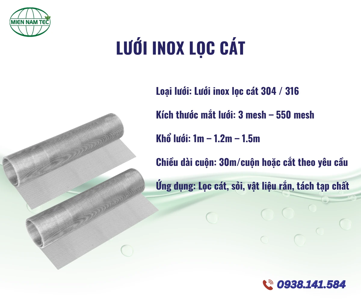 Lưới inox lọc cát 304/316 chịu mài mòn, chống gỉ, mắt lưới từ 3–550 mesh. Lọc cát, sỏi, vật liệu rắn và tạp chất trong nước hoặc vật liệu công nghiệp. Bền chắc, tái sử dụng lâu dài. Dễ vệ sinh và gia công thành tấm, khung, rổ lọc theo nhu cầu sản xuất.