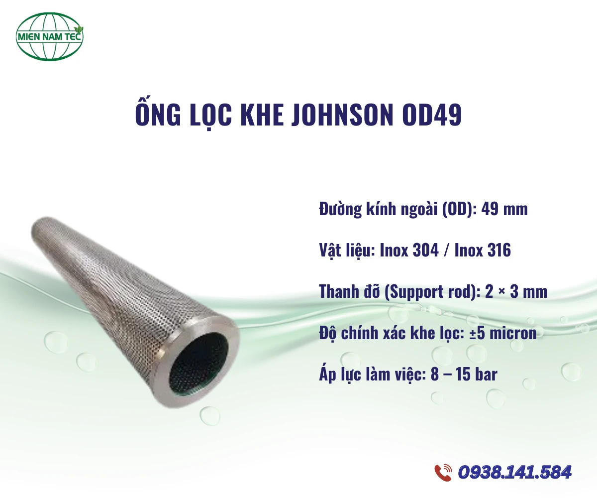 Bạn đang tìm kiếm một giải pháp lọc nước bền bỉ, có khả năng chịu áp lực cao và chống ăn mòn tuyệt đối cho hệ thống khoan giếng hoặc lọc công nghiệp? Ống lọc khe Johnson OD 49 chính là câu trả lời tối ưu nhất hiện nay. Với đường kính ngoài 49mm và cấu tạo từ thép không gỉ (Inox 304/316), sản phẩm này không chỉ đảm bảo hiệu suất lọc vượt trội mà còn kéo dài tuổi thọ công trình đáng kể so với các loại ống nhựa thông thường. Hãy cùng Công Nghệ Thiết Bị Lọc Miền Nam khám phá chi tiết thông số và công dụng của dòng sản phẩm chuyên dụng này ngay dưới đây.