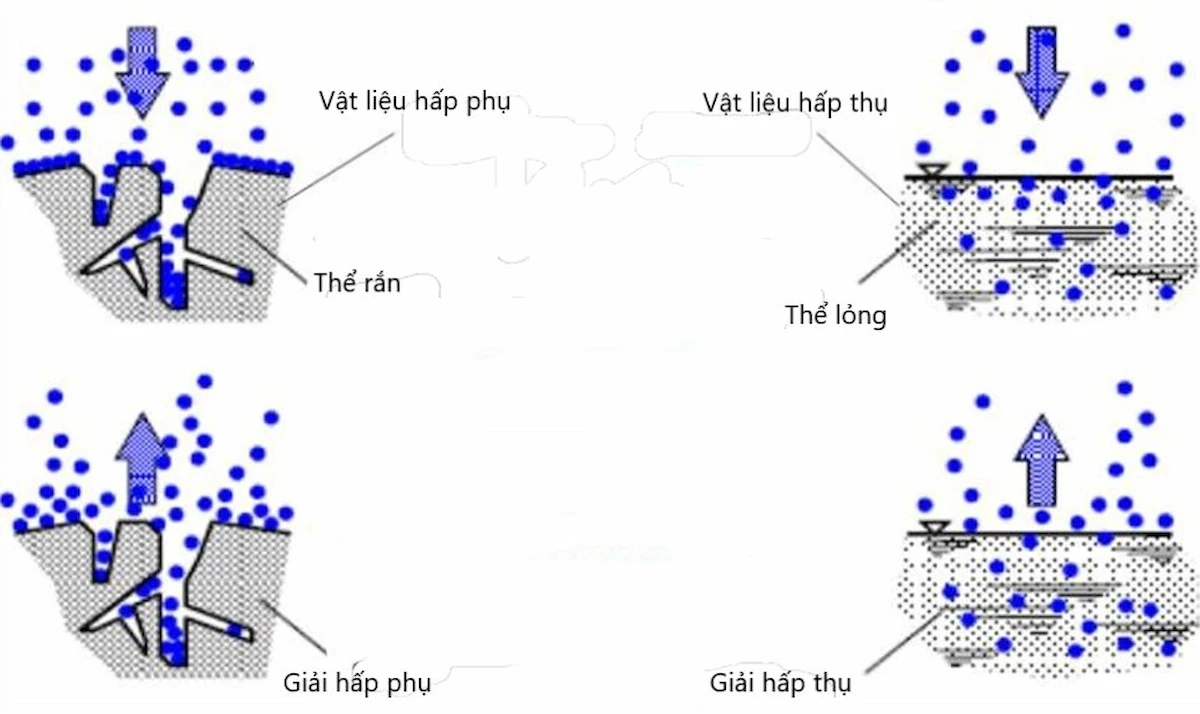 Cơ chế hoạt động chính của than hoạt tính lọc nước là hấp phụ (adsorption), một quá trình vật lý trong đó các phân tử chất ô nhiễm bị hút và giữ lại trên bề mặt của vật liệu lọc. Cần phân biệt rõ với hấp thụ (absorption), là quá trình các chất bị hút vào bên trong cấu trúc của vật liệu.